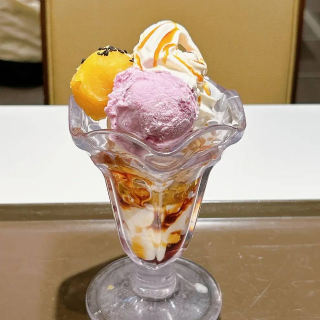 濃厚なさつまいもペーストと紫芋のアイスがトッピングされた、お芋づくしのパフェですよ〜♡(#^.^#)😊