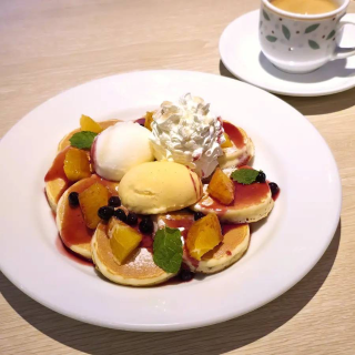 パンケーキの上にはオレンジ、ブルーベリー、ミントなどがトッピングされていてカラフルでかわいらしいですね(’-’*)♪😀